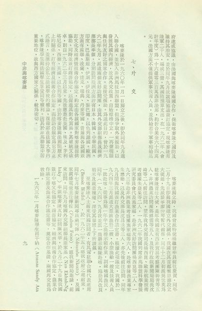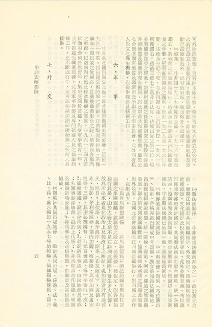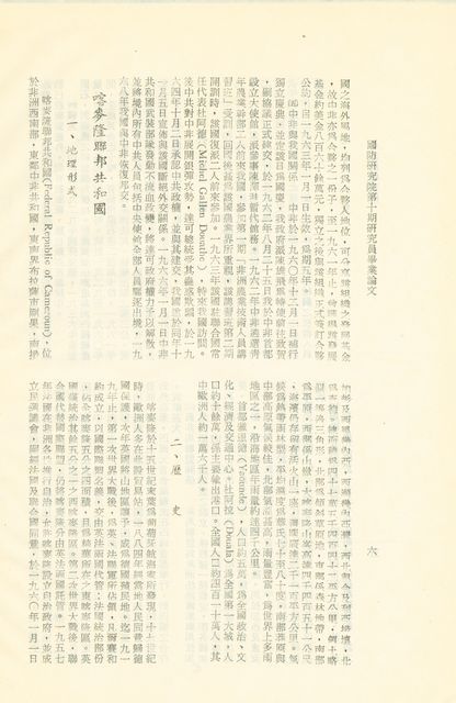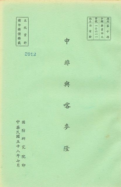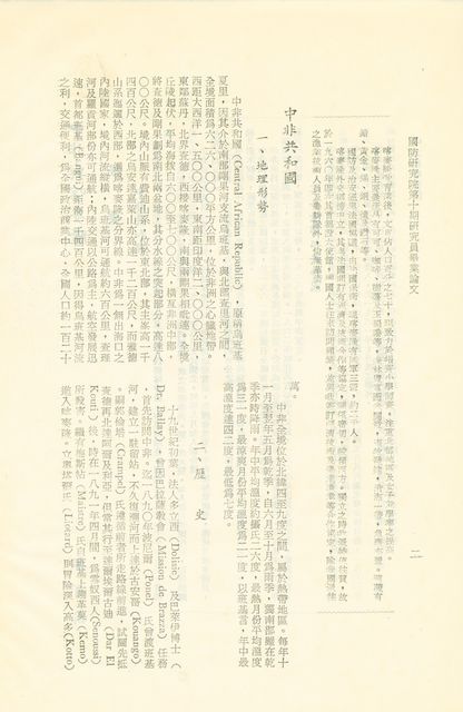 本篇旨在介紹並研究中非共和國,位於非洲中心,19世紀末葉,法國與當地酋長簽約,將其列為屬地,成立赤道非洲。第二次大戰,加入自由法國作戰,戰後法國給予自由,並成為法蘭西邦協之一員,1960(民國49)年正式獨立,隨即加入聯合國。中非政治制度為三權分立制,政體採總統制。文化落後,人民從事農業及狩獵生活,兒童就學率約40%,高級學校均係法國所設。經濟上,中非遠隔海洋,發展工商業不易,農產供輸以咖啡與棉花為主,畜牧業頗發達,礦產有鑽石及黃金。外交上,中非原為法蘭西邦協,並與赤道非洲各國結成聯盟,分別或聯合與法國簽訂有各種協定及條約,關係密切。1962(民國51)年我國在其首都設有大使館,1964(民國53)年因其承認中共,我與其斷絕邦交。嗣其內部政變,解散親共政府,1968(民國57)年我與中非復交。