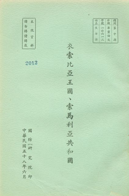 本篇旨在研究並介紹衣索比亞王國,位於非洲東北部,地形複雜,全國精華集中於中央高原區。立國於紀元前1000年,全部歷史充滿動亂災難及抵禦外侮的民族光輝。政治上,無政黨組織,國王塞拉西一世在位40年,經驗豐富,社會尚稱安定。惟王位繼承、土地改革、種族衝突等問題迄未解決。文化教育上,衣索比亞為回教文化,教育落後,雖衣索比亞國王自兼教育部長,大力推行,惜因師資缺乏,成效不彰。經濟上,以農牧為主,咖啡為最重要的農產品。軍事上,兵力在非洲頗稱強大,重要將領出自御林軍,指揮甚為靈活。外交上,為爭取多方外援,採不結盟政策,外交措施唯利是圖。