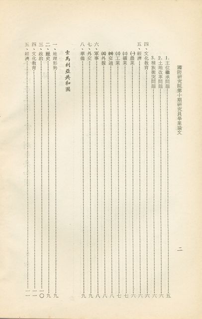 索馬利亞共和國位於非洲東北部,扼蘇伊士運河經入印度洋之出海口,控制歐、亞、非三洲水路要道。原始居民自葉門移入,曾建阿拉伯回教王國,葡萄牙國曾一度佔據。19世紀末葉起,英國、義大利兩國相互爭奪。1960(民國49)年原分屬英國、義大利兩國之索馬利蘭合併成立索馬利亞聯合共和國。政治上,採三權分立之內閣制。文化教育上,十分之九以上國民信奉回教,文化習俗均以回教是尚。教育落後,文盲佔80%。經濟上,大部人民從事農牧,以香料為外匯主要來源。軍事上主要靠蘇俄軍援,軍隊立場中立偏右,對左傾政府具監視作用。外交上,採不結盟政策,走中立偏左路線,1960(民國49)年獨立後,即於同年與中共建交。