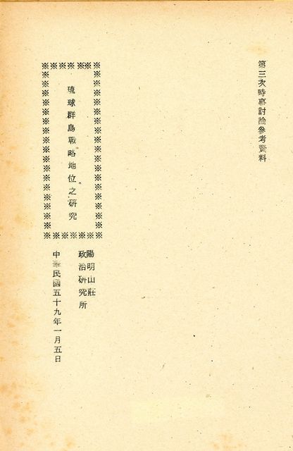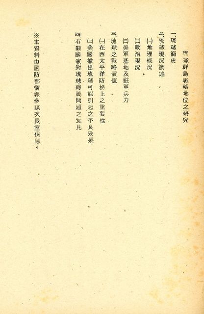 本篇旨在研究並介紹琉球,琉球與我國發生關係,始自西元605年(隋煬帝大業元年),至西元1372年(明洪武五年)太祖朱元璋派楊載出海詔告琉王,正式冊封,命名「琉球」。西元1609年(明神宗萬曆三十七年),日本薩摩藩,乘明朝武備廢弛,進兵琉球,干涉琉球內政,改造琉球人風俗,偽造琉球歷史。清朝初期琉球表面上雖仍向清廷請封納貢,但事實上已經完全日本化,西元1879年(清光緒五年)琉球王國終為日本所滅,改為沖繩縣,後因馬關條約簽訂,清廷將台灣與琉球一併割讓於日本,至此中國與琉球五百餘年之關係乃告斷絕。二次大戰日本戰敗後,琉球基於1945(民國34)年的波坦宣言脫離日本統治,美國依據1951(民國40)年舊金山和約規定,將琉球置於美國託管之下,初由美軍駐琉球司令兼最高行政長官,其後實行部份自治,由琉球人成立政府,美軍居上監督。琉球群島位於台灣與日本之間,為西太平洋上最重要的戰略島嶼,從守勢戰略為封鎖中共與蘇俄由中國大陸進出西太平洋戰略之樞紐,從攻勢戰略而言,為反攻大陸作戰之海空軍主要前進之基地,亦為美國支援東南亞各國之重要海空和後勤基地,及美軍在西太平洋上對中共與蘇俄作戰之潛艇與反潛戰之重要據點。尤其在中共發展核子的情況下,美國在琉球貯的戰略武器,更具有遏阻敵人核子威脅與軍事挑釁的作用,因此琉球的戰略地位,實關係著美國西太平洋防務與亞洲國家之安全。
