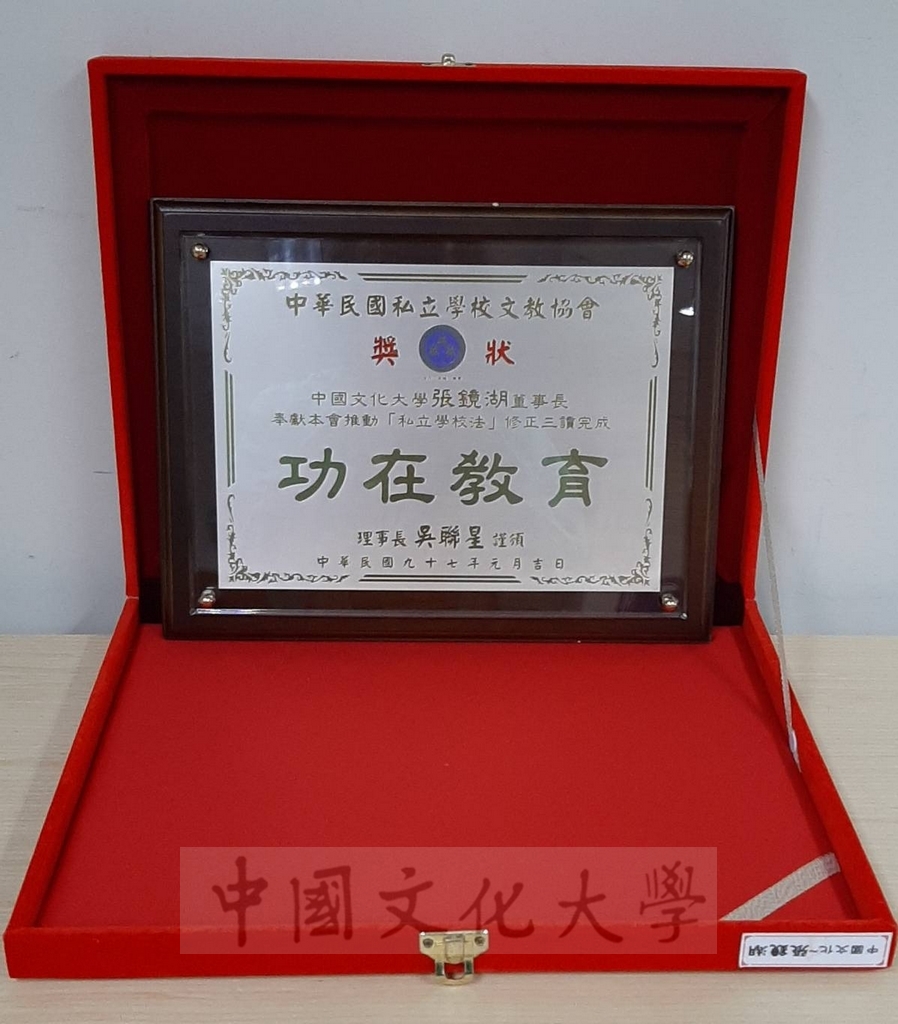• 2008年1月中華民國私立學校文教協會頒贈「功在教育」獎狀予董事長張鏡湖的圖檔,第1張,共1張