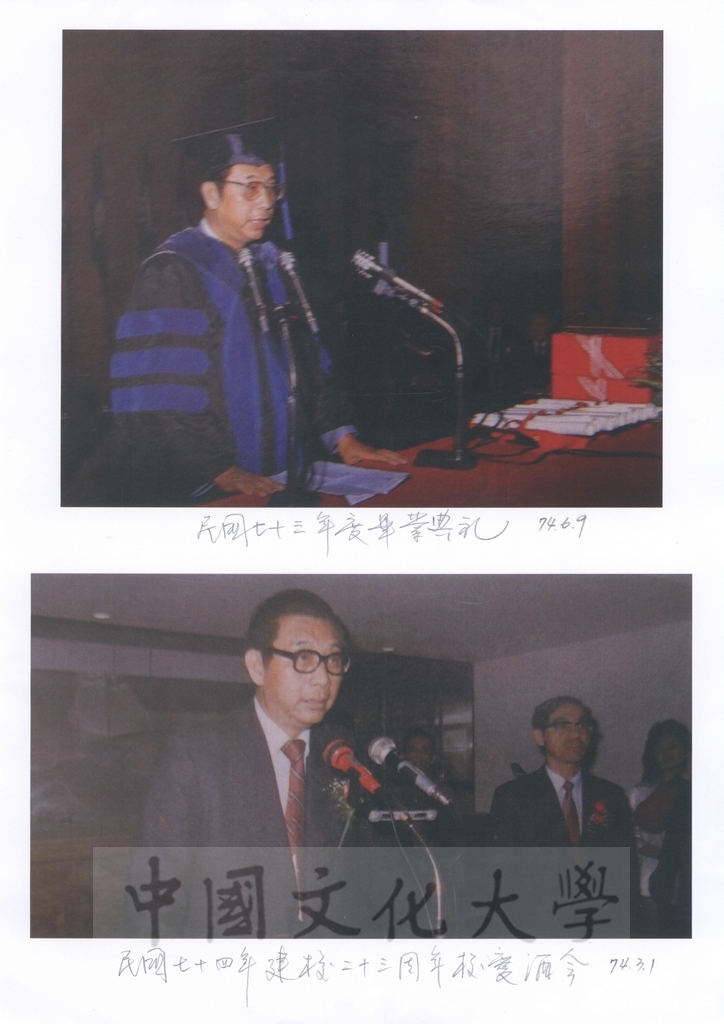 • 董事長張鏡湖於七十三年度畢業典禮及七十四年建校23周年校慶酒會上致詞景況的圖檔,第1張,共1張