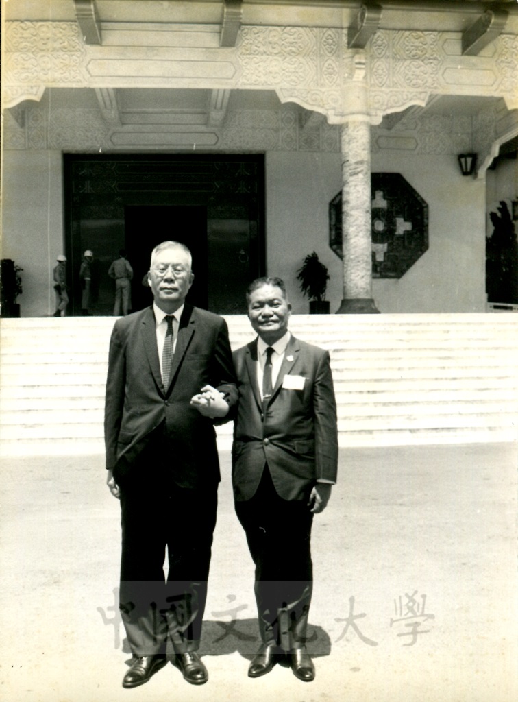• 中華學術院院長張其昀先生與名譽哲士菲律賓代表亞立甫於中山樓前合影的圖檔,第1張,共1張