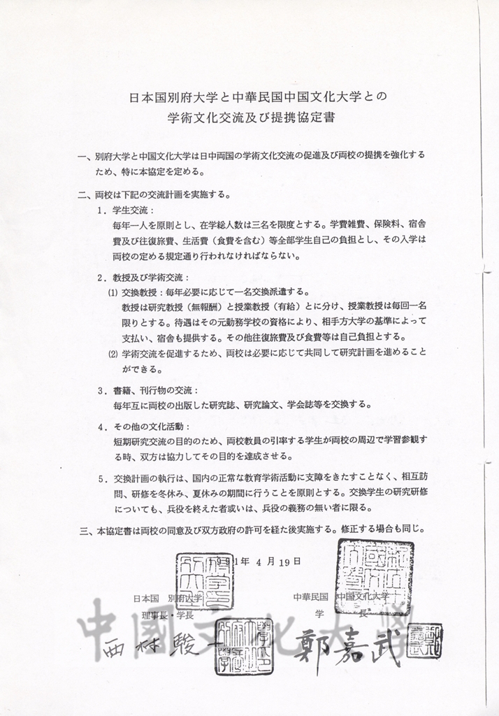 • 1991年4月19日中華民國中國文化大學與日本國別府大學學術文化交流及合作協定書的圖檔,第1張,共8張