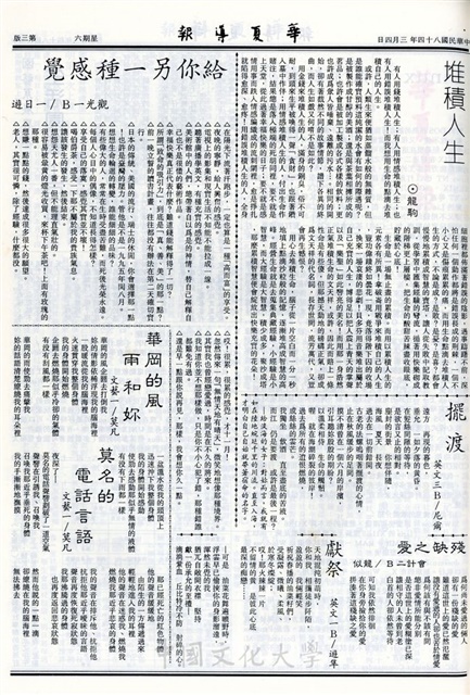 連院長政府高層首長二月十日探視嘉友返鄉服務務隊 ,夜第二屆系際盃籃球賽退費 未領取者速辦理,僑生週活動歡迎參加,美容科學技術徵文比賽 今日起受理收件,夜申請就貸者速繳完整資料,同學騎機車至夜間部請務必按規定停放,夜五系聯合系刊徵求漫畫,夜資訊學社舉辦電腦研習班,高爾夫球賽歡迎報名,電話物語,沈睡的靈魂,堆積人生,擺渡,殘缺之愛,獻祭,給你另一種感覺,華岡的風雨和妳,莫名的電話言語,生活園藝小百科,Linux作業系統簡介