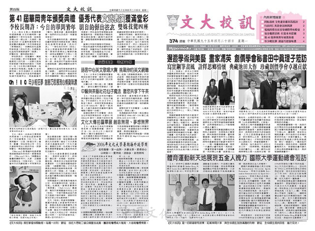邂逅學術與美藝 畫家馮英 創價學會秘書田中真理子蒞訪,體育運動新天地展現五全人魅力 國際大學運動總會蒞訪,蔡佳辰等3人通過 SPDSA'06 論文審查 首登國際學術殿堂,宿舍職涯輔導系列活動 為華岡人打造美麗未來藍圖,學生輔導中心,第41界華岡青年頒獎典禮 優秀代表文舞表演獲滿堂彩,oh!1c 年少輕狂夢 創意巧思展現心情資味濃,語言中心英文歌唱大賽 挑戰你的英文視聽,中醫與茶藝社花仙子魔法 邀您共享下午茶,文化大傳拾圓畢展 創意無限、夢想無界,2006年文化大學暑期海外遊學團,風格高雅 筆墨精湛 大陸畫家嚴其昌親撰華岡情,行政同仁英語會話班開課 邀你一起talk飆英文