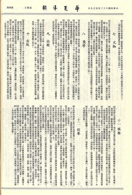 本校第六次週會將於下週一舉行,博物館舉辦約旦文物展,桌球比賽即日報名,本校印刷工廠添增數項設備,本校足球隊榮獲兩錦標,碧園農場近日發現地熱 將進行鑽井工程,交通安全作文比賽 余立龍獲獎,創辦人接見雷法章先生,系際盃球賽本週五頒獎,大專杯西洋劍比賽開始選拔,梁玉明雅擅國劇 才藝競賽獲冠軍,天才小老師與田園風光,道德重整合唱團的巡迴演唱,中國文化學院簡介