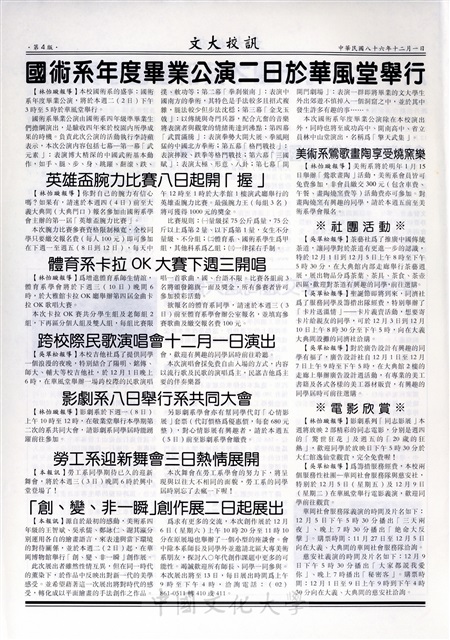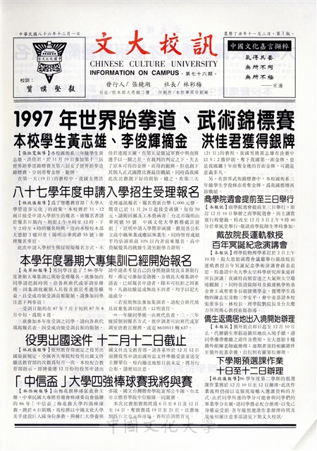 1997年世界跆拳道、武術錦標賽,八十七學年度申請入學招生受理報名,商學院週會提前三日舉行,戴故院長運軌教授百年冥誕紀念演講會,本學年度暑假大專集訓已經開始報名,僑生反僑居地出入境開始辦理,役男出國送件十二月十二日截止,「中信杯」大學四強棒球賽我將與賽,下學期預選課作業十日至十二日辦理,大專院校僑生領導才能研習營開始報名,本校餐廳衛生檢查結果公布,「認識職業資訊中心」有獎徵答抽獎活動週三舉行,圖書館新增資訊服務,論文獎助金消息,僑外生獎學金消息,「生涯、運動、就業」座談會,八十七年青訪團才藝研習營學員甄選,會計資訊與證卷市場國際化研討會四日舉行,陽明盃延至一日舉行,中國文化大學交通問題大體檢,國術系年度畢業公演二日於華風堂舉行,英雄盃腕力比賽八日起開「握」,美術系鶯歌畫陶享受燒窯樂,體育系卡拉OK大賽下週三開唱,社團活動,跨校際民歌演唱會十二月一日演出,影劇系八日舉行系共同大會,勞工系迎新舞會三日熱情展開,電影欣賞,「創、變、非一瞬」創作展二日起展出