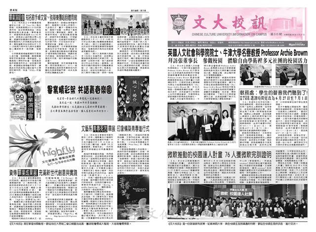 英國人文社會科學院院士、牛津大學名譽教授Professor Archie Browm,教務處:學生的聲音我們聽到了!,微軟推動的校園達人計畫76人獲微軟完訓證明,揮灑夢想汗水堅持信念舞動人生,以聲音刻劃人生藝文饗宴悠揚華岡,留學講座國貿系-教你如何快樂留學去,我們都在這裡 - 台灣,學生諮商中心[心理診所],北京訪問團報名開跑體驗傳統中國文化,畢業演唱會知名歌手卓文萱、強辯樂團唱翻體育館,國劇系畢業公演誠心˙婚介窺見人性 金錢與愛情,資傳畢業成果展充滿新世代創意與實踐,文藝系青春死苦畢展印象構築青春進行式