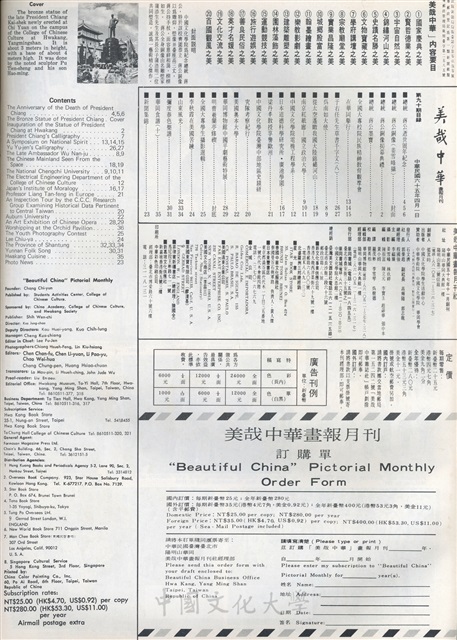 總統蔣公逝世周年紀念,總統蔣公銅像(姜雪峰攝),總統蔣公銅像揭幕典禮,總統蔣公墨寶,全國大專校院民族精神教育觀摩會在華岡舉行,于右任先生草書千字文(八),吳南如大使,從太空遙瞰我國大陸錦繡山河,南京紅紙廊—國立政治大學,中國文化學院電機工程學系,日本道德科學研究所‧廣池學園,梁丹丰教授享譽歐洲,中國文化學院臺灣中部地區史蹟研究隊考察紀行,美國奧本大學,華岡博物館中國平劇藝術特展,明曹羲蘭亭修禊,全國大專學生攝影選輯,李秋霞在美國苦練,山東風光,彌度春色樂譜,華岡食譜(十),新聞集錦