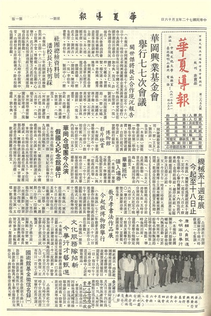 華岡興業基金會舉行七七次會議,社團總檢資料展,潘校長主持剪綵,華岡合唱團今公演,假國父紀念館舉行,機械系十週年展,今起至十八日止,教孝月書法作品展今起假博物館舉行,文化服務隊招新今舉行才藝甄選,圖片說明,國術館基金徵信名錄,華岡郵展系列之四:舞龍與龍舟,民族主義與辛亥革命,本校海洋研究所進行建教合作與國際研究,地質系何春蓀教授入選馬奎士世界名人錄,華岡合唱團簡介,畢服會總幹事競選活動開始