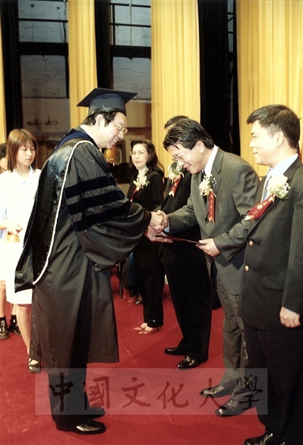 2001年3月1日中國文化大學建校39週年校慶大會,董事長張鏡湖頒贈傑出校友當選證書。