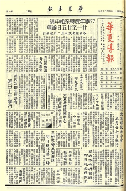 77學年度轉系組申請 廿一至廿五日辦理 各系組考試五月二日起擧行,青訪團甄選 舞台監督,女聯母親節活動 即起登記,學碩士服缺損 五月中換領,第四次師生座談會 明日上午擧行,動態服裝展示會 本月廿七日擧行,巫雲聯展 今日推出,大夏法律服務中心 歡迎同學多加利用,電腦語實退費 即日起領取,家政咖啡研習班 即日起受理報名,本週電影 暫停放映,三研社潮系列演講 明日進行第一場,失物招領,家政便當明推出 香酥雞排,請讓我們 關心您!,家政住宅 今午開放,華夏攝影賽 今起退件,RECOGNIZE THE CAR ⑨,真理社福音系列之二,有關鑽石的四個C,淺談 命運(上),三研社「潮」系列演講第一場,聯勤陽明山俱樂部優待師生,本校日間部77學年度 學生轉系組標準表 (上)