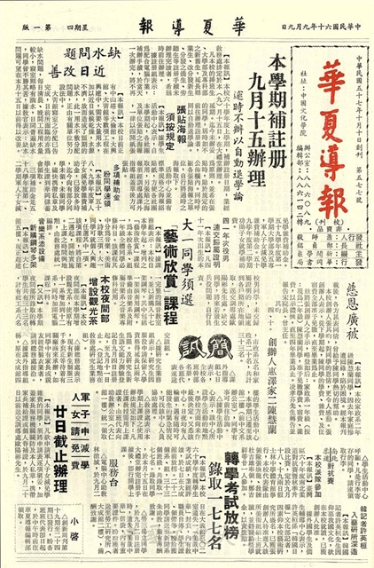本學期補註冊 九月十五辦理,缺水問題近日改善,張貼海報須按規定,多項補助金 盼同學速領,四一年次役男 速交歸屬證明,大一同學須選「藝術欣賞」課程,音樂系添設備 新購鋼琴多架,本校夜間部 增設觀光系,慈恩廣被,簡訊,南北柔道對抗賽 本校派隊參加,韓記者許英桓 入藝研所深造,轉學考試放榜 錄取一七七名,軍人子女申請減免學費 廿日截止辦理,小啓,中國文化學院碧園農場業務實施計畫綱要