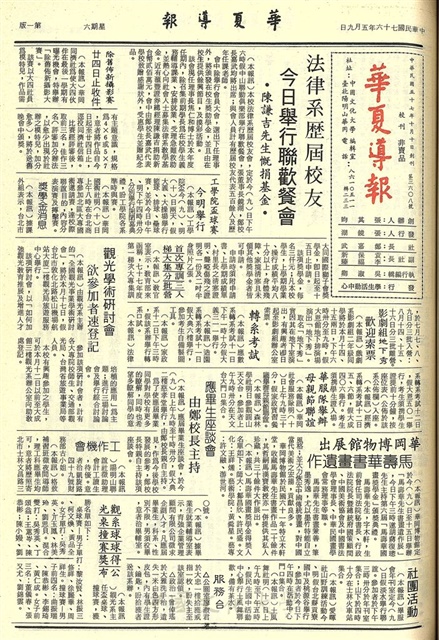 法律系歷屆校友 今日舉行聯歡餐會,除舊佈新攝影賽 廿四日止收件,工學院盃球賽 今明擧行,獎學金消息,首梯次大專集訓分三批入營,觀光學術研討會 欲參加者速登記,華服隊擧辦 母親節聯誼,華岡博物館展出 馬壽華書畫遺作,轉系考試,應畢生座談會 由鄭校長主持,影劇組地下秀 歡迎索票,觀光系桌球撞球賽得獎公布,七十五學年度第一學期獎學金徵信錄(七),自助旅行 暢遊溪頭,客棧,七十五學年度第一學期 活動中心經費支出一覽表