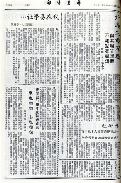 教師汽車停車證 在總務處受理申請,財經論壇名人演講,衛生署徵求,書城教師卡,菊苑千代紙藝 江流板刻書法 古流松纓花藝 聯展,學術研究資訊套裝軟體研討,男女生宿舍尚有空床位,大陸紅樓文化之旅,廣研社舉辦廣設巡禮,商管社書展 製圖儀器展,花旗學生信用卡 歡迎同學申請,書評週系列專文,尋找不講道理的人,大陸當代文學研究會,趁著心還能飛,行過生命深處,外研社―培養優秀領導人才為宗旨,我在易學社…,夜間部81學年度幹研省思,如何做自我評估?,時事研究社今晚演講,建立新天地新文化的世界文化研究社,舊心情致新鮮人