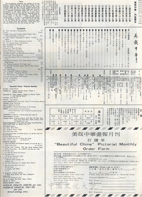 國父墨寶,慈湖賓館(姜雪峰攝),東加國王杜包四世訪華,抗戰老人雪鳴遠神父百年誕辰,蘇光前博士的家庭,杜聰明先生書法,南太平洋袖珍王國—東加,范鶴言先生,扁鵲畫像,趙孟頫的繪畫,我國古代文物,史前文物—彩陶,殷周文物—青銅器,梁丹丰女士環球之旅—鉛筆畫選,五陵六逸畫展,青年雕塑家蒲浩明作品,第二屆亞太區童子軍大露營,佛教四大名山之一—九華山,韓國五大古公之一—昌德宮,華岡博物館展出日本浮世繪,三十年的台灣曹族山胞,宋高克明秋林水鳥,插花藝術(十一)—生花「松竹梅」與「七種傳」,秋夜間笛樂譜,新聞集錦