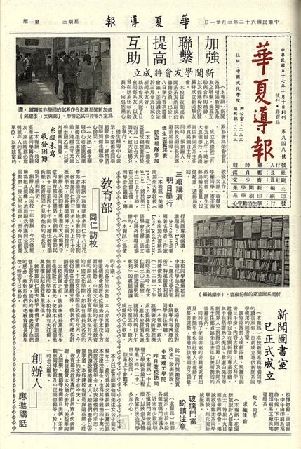 加強聯繫提高互助,僑生籃球盃賽歡迎組隊參加,三項演講明日舉行,系級未寫收發困難,教育部同仁訪校,新聞圖書室已正式成立,觀光同學,玻璃門窗盼請注意,中正理工學院昨日蒞校訪問,教育部長蔣彥士召見陳效仁教授,漿泳後的健康,林崇墉教授捐款卅萬元,僑生聯誼春假郊遊,獎學金消息