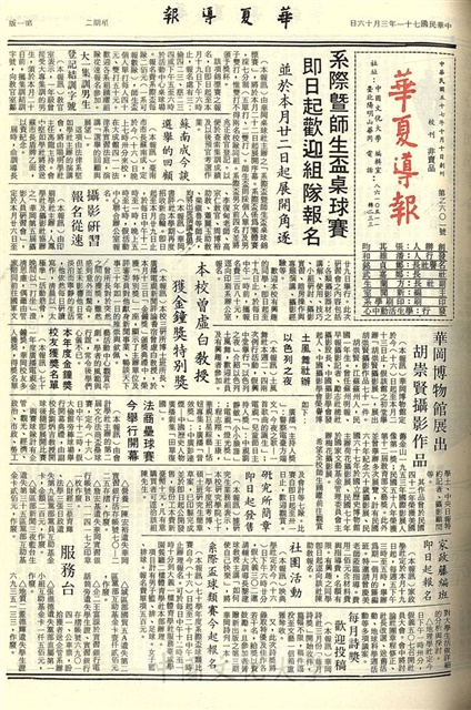 系際暨師生盃桌球賽即日起歡迎組隊報名,大一集訓男生登記結訓字號,蘇南成今談選舉的回顧,攝影研習報名從速,本校曾虛白教授獲金鐘獎特別獎,土風舞社辦以色列之夜,本年度金鐘獎校友獲獎名單,法商壘球賽今舉行開幕,華岡博物館展出胡崇賢攝影作品,研究所簡章今日起發售,家政籐編班即日起報名,社團活動,每月詩獎歡迎投稿,系際盃球類賽今起報名,服務台,如何使用存證信函,華岡同濟社簡介,熹平石經的故事 兼談漢隸的寫法,教務處註冊組七十年度工作檢討,教務處語文中心七十年年終工作檢討,中正圖書館 書刊處理準則