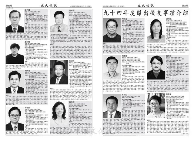 創意校園話說華岡慶祝本校創校43週年校慶,活力華岡文化飛揚歡慶建校43週年校長感言,化雨均霑為華岡服務30年資深教職員受獎名單,94年度傑出校友事蹟介紹,教學特優教師獎,行政人員績效特優獎,為慶祝本校43週年校慶日本創價學會及先鋒樂團將於3日來訪,名譽理學博士學位頒贈典禮3日舉行,43週年校慶網站全紀錄