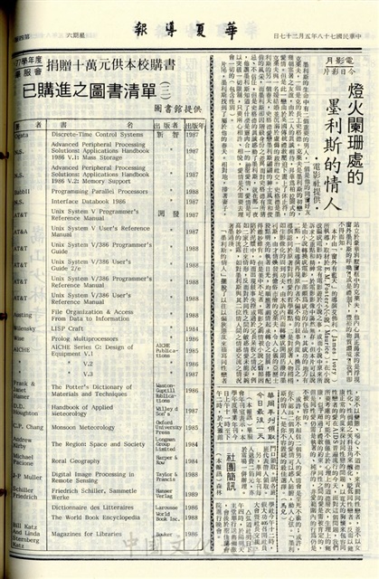 萬安十二號演習5月29日實施,社團總檢下週一展開,軍訓課本退費本月底前領取,中華語文研習所舉辦海外進修,出國競賽開會之團體個人應用中華台北譯名,多國籍企業研討會今日舉行,廣告三舉辦學術大餐,民族藝術薪傳獎即日起受理推薦,秦禎琵琶演奏會今晚假中山堂演出,送舊活動,孝道思想的再返省,你是我的驕傲,活動中心明日影片欣賞,中國金字塔漫談,嵩山少林寺(下),假期旅遊注意交通安全,燈火闌珊處的墨利斯的情人,華岡年刊領取今日最後一天,77學年度畢服會捐贈十萬元供本校購書已購進之圖書清單(三)