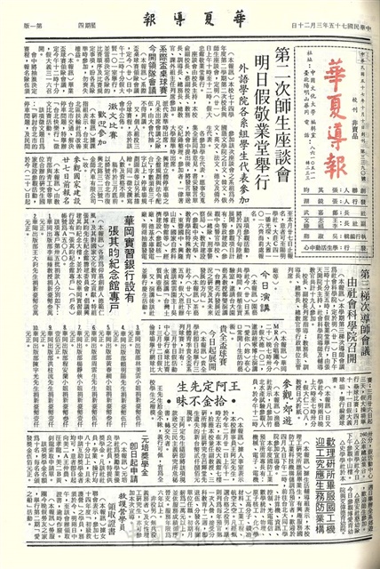 第二次師生座談會 明日假敬業堂舉行,系際盃桌球賽 今開領隊會議,徵文比賽 歡迎參加,參觀國家建設 廿七日前報名,第三梯次導師會議 由社會科學院召開,今日演講,貴全盃球賽 今日起展開,華岡實習銀行設有 張其昀紀念館專戶,參觀.郊遊,王阿定先生.拾金不昧.,元培獎學金 即日起申請,歡迎理工研究所應畢生服務國防工業機構,救護營學員 領取證書,何處是兒家—與學生生活有關的心理衛生問題,哈雷彗星 觀測手記,郵政博物館廿週年特展