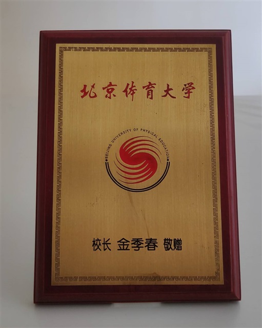 1998年12月1日北京體育大學(Beijing Sport University)致贈木製鍍金校徽立牌