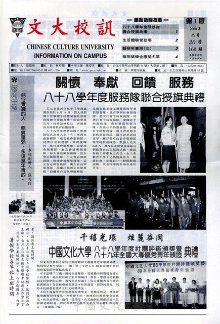 關懷 奉獻 回饋 服務 八十八學年度服務聯合授旗典禮,千禧光環 炫麗華岡 ,尊重金命 學習生活 強健體魄 經驗分享 推廣教育部之「生活體驗營」登場,珍重再見 僑外生畢業歡送會後記,八十八學年度實驗室、實習工場安全衛生檢查評比,藝術研究所美術組畢業展(三),國防大學校長--夏上將瀛洲來訪,八十八學年度社團評鑑頒獎暨八十九全國大專優秀青年頒證典禮,八十八學年度帶動中小學學生社團發展計劃成果發表與頒獎典禮,舞4321瘋狂倒數畢業舞會,榮譽榜 八十八學年度第二學期 華岡獎學金獲獎名單,八十八學年度全國性外語比賽或表演前三名獎金,八十九年青年節表揚大專優秀青年校內初選錄取名單,全國學生創意比賽暨獲獎作品展覽