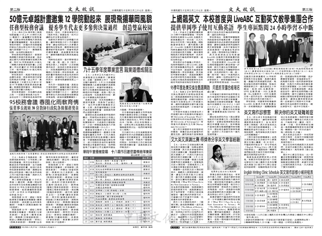 感謝華岡人的心意 國會殿堂領袖王金平院長蒞校訪問 ,本校成為韓國慶南大學第一所 跨國交換生姊妹校,上網飆英文 本校首度與LIVE ABC互動英文教學集團合作,95學年度赴美交換生甄選開跑 月底前至國合組報名,英文寫作診察室 解決你的英文疑難雜症,文大英文演講比賽 得獎者分享英文學習經驗,王金平院長的廣告替身 體育系陳文慶代言拍攝競選短片,彰友會藝薪傳 道地傳統小吃,第二屆校歌合唱比賽校歌組 由西樂系拔得頭籌,彩妝講座讓你亮麗有神 散發光彩,黃綠紅 你要哪一種? 麥當勞廣告明星 吳仲強,50億元卓越計畫邀集 12 學院動起來 展現飛揚華岡風貌,九十五學年度畢業宣言 職業道德成關注,95校務會議 春風化雨教育情,華岡午宴優雅登場 十八場作品邀您盡情徜徉樂聲