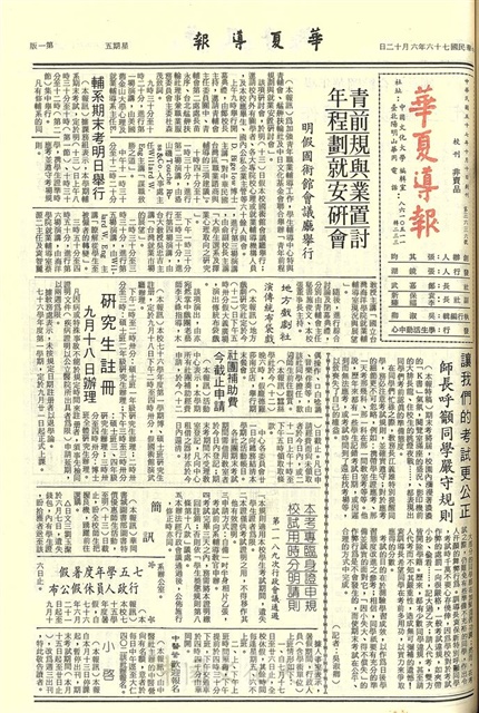 青年前程規劃與就業安置研討會,輔系期末考明日舉行,地方戲劇社 演傳統布袋戲,研究生註冊 九月十八日辦理,社團補助費 今截止申請,讓我們的考試更公正 師長呼籲同學嚴守規則,本校考試專用臨時身分證明申請規則,七五學年度暑假 行政人員休假公布,中醫營歡迎報名,七十五學年度第二學期獎學金徵信錄(五),七十五學年華岡綜合性社團 工作競賽成績公布,下學期各系組註冊 九月十七日起辦理,亞美科技屏示會 歡迎師生參加,工讀金發放,榮民週徵答 明日前領獎,青春之星決賽 明晚舉行