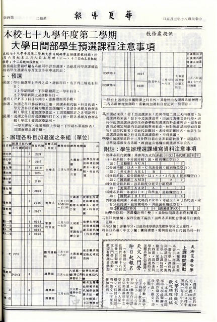 表現文大特色海報設計比賽 收件日期延至3月25日,山胞族籍學生奬助學金十日前申請,書城圖書部 代購教科書,搭乘教職員専車 請出示乘車證,工讀機會,登山安全研習營 即日起報名,大專青年書畫賽觀摩展 四月一日起收件,春假何處去 ? 本校校友總會籌辦 大陸江南七日遊,社團招新,電影欣賞,81年度大專集訓第一梯次 即日起受理申請,系際盃球類賽 今起在體育學社報名,註冊程序單 儘速繳回,房間招租,談氣功養生之道 六個夢之一 一長生不死,友翔實業公司簡介,第22屆學生活動中心招新辦法,亦狂、亦俠、亦温文,富有鄉土風味的舞蹈一土風舞,市交擧辦協奏曲大賽本月 十八起日報名,80˙漫畫˙台北即日起收件,年刊資料 儘速繳交,社團例行活動教室 本週起辦理登記,花藝之美一插花社招新,本校七十九學年度第二學期 大學日間部學預選課程注意事項,美術系廣告學 上課時間異動,天文入門營 即日起報名,文學創作徵文 歡迎踴躍投稿