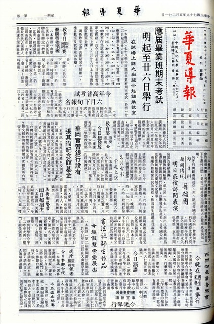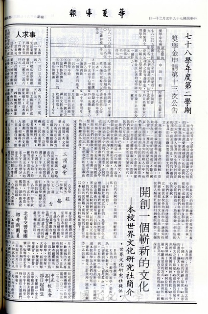 應屆畢業班期末考試明起至廿六日舉行,教孝月即席演說賽優勝者速領獎 ,今年高普考試六月下旬報名,中正高中校友會即日起招生,北市交響樂團招考新團員,開創一個嶄新的文化,七十八學年度第二學期獎學金申請第十三次公告,與動物為伍 畜牧系展.24日推出,影劇三班展 關於果陀等待II,田納西.威廉斯素描,於週展購書者請領書,MRA日記 駕馭自己,群英會系列報導(1) 淺談社團總檢,黑與白的饗宴,慢慢地奔馳,新潮電影週專文(1) 標榜強烈個人風格,社工週活動專文(1) 成長的路,木瓜盃桌球賽,總幹事普選事宜會議今晚舉行,選修廣播電視課者今日參觀台視,書法社師生作品今起假慈孝堂展出,家政系今日演講,西樂四畢業音樂會今晚在國家音樂廳舉行,美術陶藝營即日起招生,華岡實習銀行設有張其昀紀念館基金,名片電影今起上演,匈牙利 / 韓國傳統舞蹈團明日蒞校訪問表演,教育部清寒獎助金今日起發放