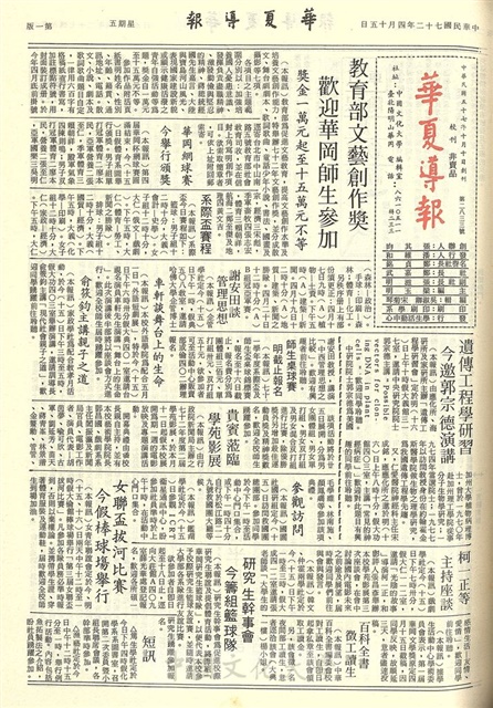 教育部文藝創作獎,歡迎華岡師生參加,華岡網球賽今舉行頒獎,系際盃賽程,謝安田談管理思想,車軒談舞台上的生命,俞筱鈞主講親子之道,遺傳工程學研習,今邀郭宗德演講,師生桌球賽明截止報名,貴賓蒞臨學苑影展,柯一正等主持座談,百科全書徵工讀生,研究生幹事會今籌組籃球隊,女聯盃拔河比賽,今假棒球塲舉行,憲文周年祭,汽車保險及緊急處置,轉系問題面面觀(之二)轉系的心態,小畢的故事之導演-侯孝賢簡介,淺談車禍傷害賠償,明人出警、入蹕圖古畫郵票簡介