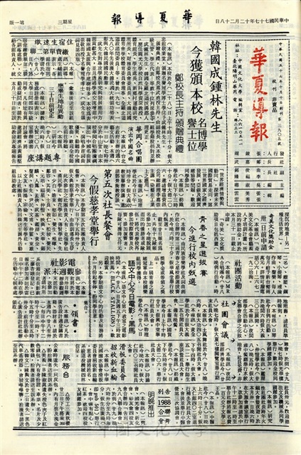 韓國成鍾林先生今獲頒本校名譽博士學位,華岡合唱團演出中國名曲,專題講座,第五次社長餐會 今假慈孝堂舉行,奇美文化獎助金 卅一日前申請,青春之星選拔賽 今進行校內甄選,告別1988聯合舞會 明晚推出,食品營養信箱,古蹟今遊10 南區篇,影劇雙週戲劇演出介紹,學生活動中心存在的價值,國術講座,理想與現實,國劇列車(五),成鍾林先生頌詞,本校日間部學生活動中心 總幹事選舉委員會公告 (中華民國七十七年十二月二十八日第OO六號),七十七學年度第一學期 獎學金獲領公告(一)
