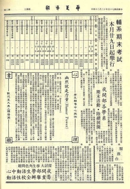 第九次社團負責人溝通餐會,東莞獎學金即日起申請,臺大醫院徵才,第二屆華岡論劍明日假大孝館舉行,理舊品獻愛心盼師生響應,紀念載運軌教授誕辰將舉行學術演講,廣告設計社社慶茶會,大一班代洽領高中畢業證書,湯圓晚會,耶誕夜行動!,今日演講,輔系期末考試本月廿九日起舉行,夜間部各學系期末活動陸續展開,幽默就是力量Humor Power ,探討大學生角色問題夜間部學生活動中心籌畫舉辦全校性活動