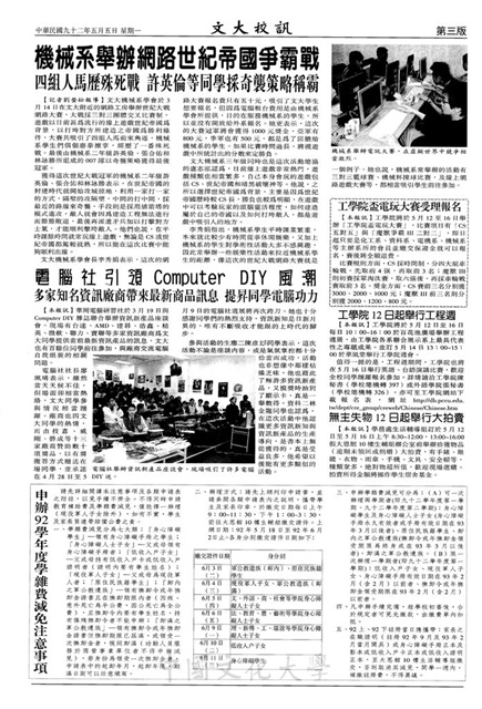 文大邁向國際一流學府舵手林彩梅校長卸任,文大研究所碩博士班全面實施英語能力檢定,托福筆紙測驗成績與其他英文能力檢定測驗成績對照表,文大開課讓研究生不再擔心考托福,文大校定密集英語課程科目表,文大已故戲劇巨擘王生善獲總統褒揚,渣打銀行提供文大同仁房貸優惠專案,畢業典禮致詞代表甄選受理報名,數位學習中心徵工讀研究生,畢服會發放證書夾、舞唱會入場卷,人生講座場次表,機械系舉辦網路世紀帝國爭霸戰,電腦社引領Computer DIY風潮,工學院盃電玩大賽受理報名,工學院12日起舉行工程週,無主失誤12日起舉行大拍賣,申辦92學年度學雜費減免注意事項,德國席根媒體報導文大交換生生活學習情況,文大韓國遊學團與國際學生一同學習,SARS防疫不鬆懈 持續作戰,認識世界各國講座6日起開講,兒童節目研究室一員同學DJ夢,華岡攝影社本週舉行攝影展,廣告系7日探討公視發展,文藝書展5日舉行