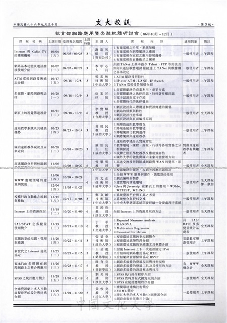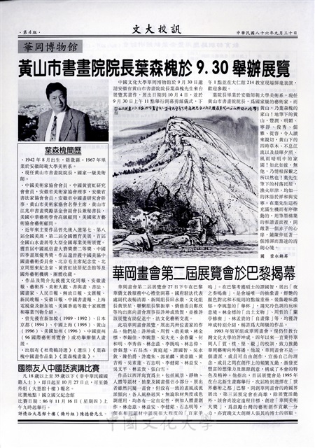 文化大學發行全國第一張智慧IC學生,徵稿令,軍訓室公告,86學年度研究生助學金注意事項,研究生助學金作業流程,僑外生獎學金消息,名校遊學夢想起飛繞地球學英語系列,預官考選作業講習,教育部網路應用暨套裝軟體研討會,華岡博物館,葉森槐簡歷,國際友人中國話演講比賽,華岡畫會第二屆展覽會於巴黎揭幕
