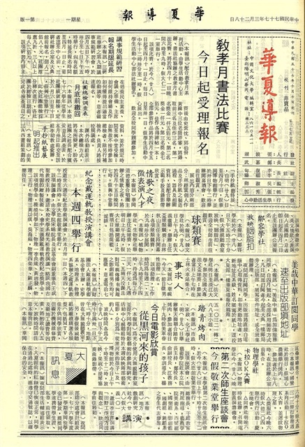 教孝月書法比賽今日起受理報名,議事規範研習報名期限延長,社團總檢調查表 月底前繳回,手抄紙藝展 明起推出,情歌之夜 徵表演人才,鄒容學社放映胭脂扣,球類賽,美哉中華訂閱同學速至出版部填地址,紀念戴運軌教授演講會 本週四舉行,踏青烤肉,物理學社卡拉OK大賽,第二次師生座談會今假敬業堂舉行,今日電影,大夏訊息,本校學生社團活動預告表,學生活動中心說明「華夏導報採自由訂閱」動議延會一事,每日一花 展葛鬱金等,迎接77年青年節歡唱系列活動之三,七十五學年度第二學期語文電腦實習退費儘速領取,廣告設計週系列活動 今起至四月二日展開