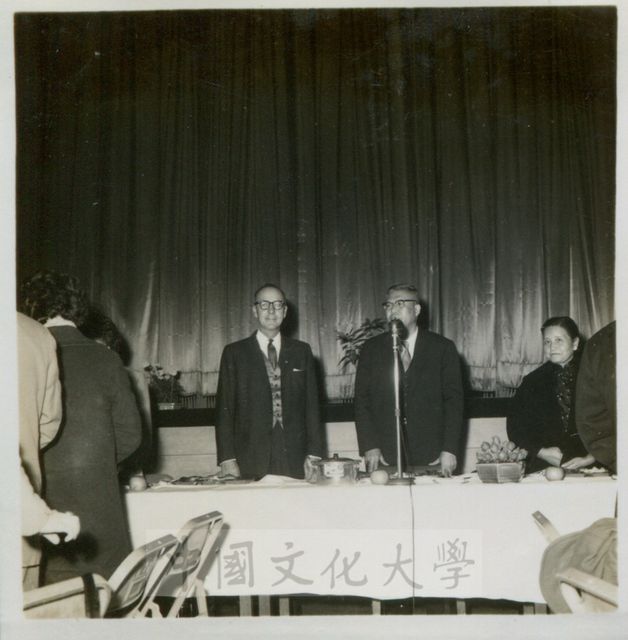 此為國防研究院第二期研究人員與三軍聯大正規班第九期學員於1960(民國49)年12月19號上午在三軍聯大禮堂合併舉行畢業典禮,並於典禮結束後至介壽堂舉行餐會。圖為國防研究院主任張其昀(中)向與會研究學員致詞景況。(右一)為張其昀先生夫人龔柏英女士。