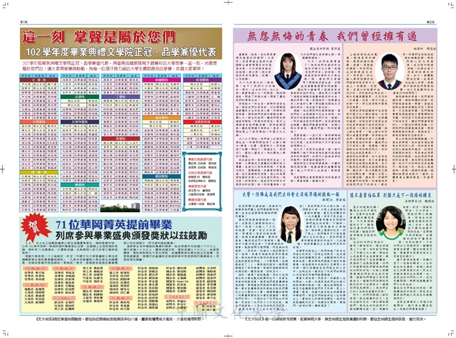 質樸堅毅之精神 ,給明日的華岡校友,總統賀電,副總統賀電,這一刻 掌聲是屬於您們,71位華岡菁英提前畢業,無怨無悔的青春 我們曾經擁有過,大學,彷彿是為我們出社會之前做準備的跳板一般,請不要害怕孤單 別離只是下一段路的轉角,我是最愛讀書的人!,102學年度圖書館借閱書籍優異人員,畢業生之最,致青春 2014畢業主題照,校友重新充電計畫,畢業生校園資訊服務停止公布