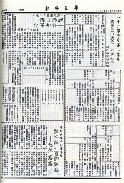 下學期助學貸款 今日起受理申請,用愛喚醒徐敖 募款活動開展,中西文參考問題大賽 歡迎師生踴躍參加,娟印研習營今 日截止報名,斗數擇友費用 將捐助徐敖,宿舍門禁延時調查 今日截止收件,戴運軌教授紀念演講會,深藏我心深處的記憶,尊重生命,李斯刪繁作小篆,顏炳立談房地產,夕陽下最美麗的女神―金星,衝向天外天的一刻―王立宇宙軍,八十二學年度第一學期獎學金第十六次公告,認識自我―興趣界定,驚惶與狂喜的圈套―散彈露露