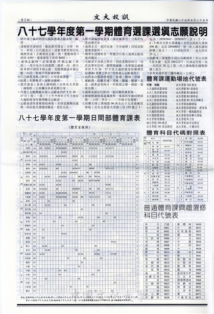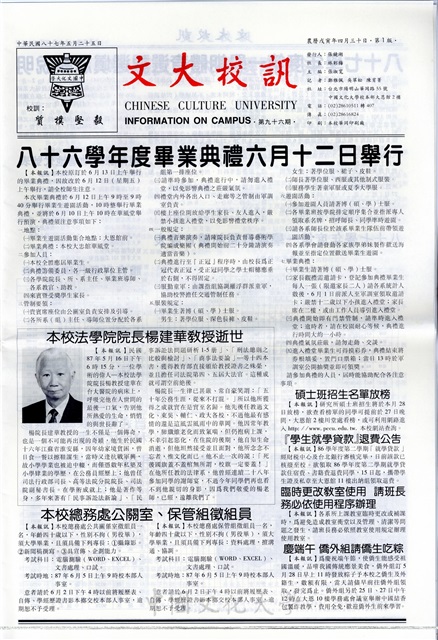 八十六學年度畢業典禮六月十二日舉行,本校法學院院長楊建華教授逝世,碩士班招生名單放榜,『學生就學貸款』退費公告,臨時更改教室使用 請班長務必使用程序辦理,慶端午 僑外組請僑生吃粽,本校總務公關室、保管組徵組員,八十七學年度第一學期體育選課選填志願說明,體育課運動場地代號表,八十七學年度第一學期日間部體育課表,體育科目代碼對照表,普通體育課興趣選修科目代號表,中國文化大學選課辦法,溫馨談心 校長以餐會款待全國大專優秀青年,《社團活動剪影》,學生選課、情感諮商與急難救助 校方提供多管導輔導與協助,圖書館資源探索 歡迎多加上網查詢,身心障礙同學六福村之旅,98’大夏合唱團「仲夏夜之夢」,新聞系影像組畢業攝影展,戲劇系影劇組大二〈達摩〉與〈郵局〉期末公演,「反四方連續」四人畢業聯展
