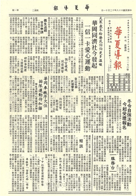天寒歲末給榮民伯伯更多溫暖,華岡同濟社今發起一信一卡愛心運動,僑生返鄉廿日申請,預官複選試前講習,總幹事競選今展開活動,登山社辦武陵攀登,科技展覽歡迎參觀,冬令自強活動今起受理報名,華岡車秩序久佳排隊運動待加強,許坤成談世界藝壇動態,丁中江談當前國際情勢,畢服會「留學之路」備索,出席第九屆亞洲與太平洋區會計師會議報告,「中文之夜」後記,歲暮天寒冷‧信卡傳溫馨