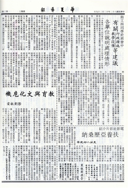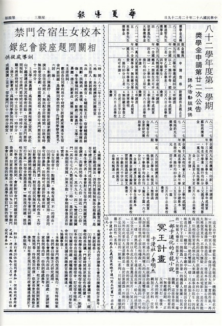 國樂新秀奏新聲 今晚在社教館演出,PGC年終票選 得獎名單公布,預官考選考前講習,影片欣賞,青訪團校內徵選 錄取李絢芬等廿名同學,九三年書法學術研討會 本校黃緯中郭伯佾應邀提出論文,服務隊訊,物理二班會反映:請修復網球場後的道路,紡工四同學於班會中有關行政措施教學設備等建議各單位說明處理情形,教育與文化危機,電影社影片介紹,廣告人的生活,愚人之歌,《進階珠寶專欄》珍珠(五),八十二學年度第一學期獎學金申請第廿二次公告,本校女生宿舍門禁相關問題座談會紀錄,一部卡通化的古龍小說