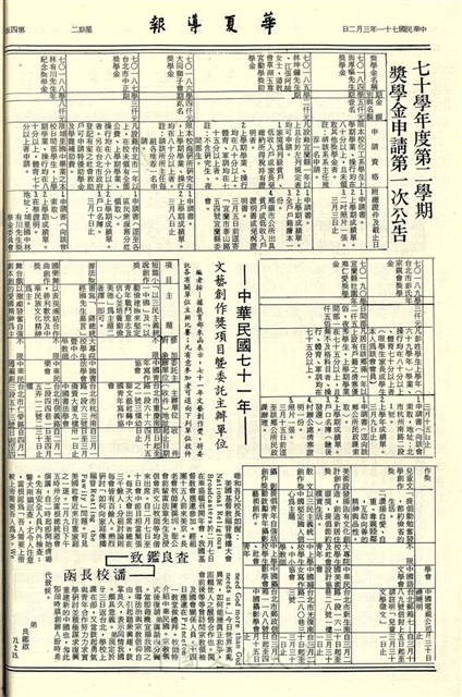 建校廿週年慶祝大會 昨假華風堂舉大盛行,哲學書籍展歡迎參觀,孔孟論文賽錄取名單,民族音樂週活動包括演講展覽等,註冊程序單須儘速繳回,本學期工讀申請即日起領表登記,僑生課業輔導今起報名,中正獎助學金今起受理申請,廣告社舉辦海報設計展,服務台,城區部學生活動中心 慶祝建校廿週年活動,城區部教職員工呈獻豐碩成果,華岡哲學週舉辦展覽座談演講會,活動中心各社團校慶當天之活動,華岡同濟社 社慶趣味競賽,插花展,華岡校慶,不老歌,七十學年度第二學期獎學金申請第一次公告,中華民國七十一年 文藝創作獎項目暨委託主辦單位,查良鑑致潘校長函