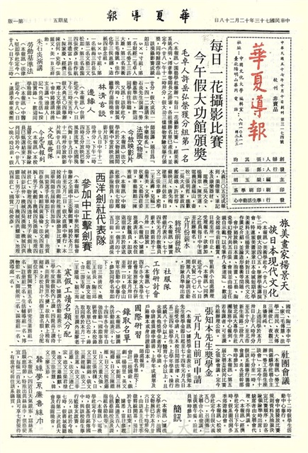 每日一花攝影賽今午假大功館頒奬,朱石炎演講勞動基準法,林清玄談邊緣人,法國文物展今放映影片,文化服務隊今完成報到,西洋劍社代表隊參加中正擊劍賽,元月份薪水將提前發放,旅美畫家楊景天談日本現代文化,社服隊工作研討會,寒假工讀名額分配,國際研習錄取名單,張知本先生奬學金元月九日前可申請,社團會議,蠶絲學系廉售絲巾,入社會前的心理準備,一九八四年西洋音樂之回顧,七十三學年度第一學期華岡奬學金獲領名單,未成年養子女的婚姻