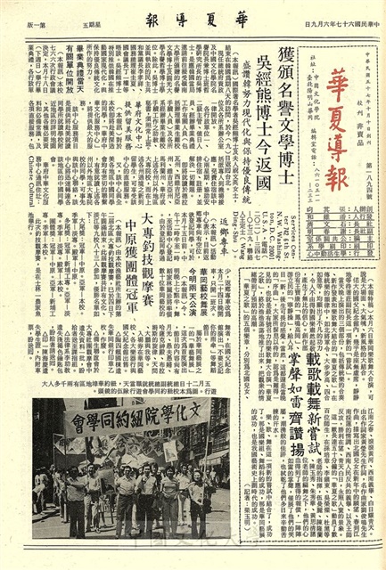 獲頒名譽文學博士 吳經熊博士今返國,大專釣技觀摩賽 中原獲團體冠軍,畢業典禮當天有關單位開放,華府文化中心提供留美服務,返鄉專車,華岡藝校舞展今明兩天公演,大專釣技觀摩賽中原獲團體冠軍 ,載歌載舞新嘗試 掌聲如雷齊讚揚,軍訓工作報告,新聞學系工作報告,66學年畢業校友鄉鎮聯絡幹事