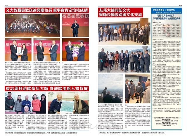 16學系報到率逾九成五 王代理校長親頒獎金,第十一屆世界海洋文化研究所協議會(WCMCI)學術大會,大傳系與宜蘭大學合辦首屆工程技術與應用研討會,文大教職員歡送徐興慶校長 董事會肯定治校成績,友邦大使同訪文大與師長暢談跨國文化交流,曾志朗拜訪歐豪年大師 參觀歐美館人物特展,學生諮商中心{心靈診所}
