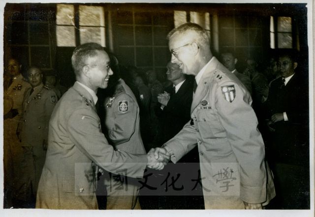 國防研究院研究員在院期間,為使加深對國際動態之了解與研究,經常利用課餘時間,邀請中外專家蒞院作專題演講,並速記講詞,交換意見。國防研究院於1961(民國50)年4月17日特邀美國駐防西太洋之第七艦隊司令葛里芬(Charles Donald Griffin)中將蒞院講演,講題為「海軍在國際競技場中的任務」。參與聽講者有國防部彭總長、陸軍羅總司令、海軍黎總司令、空軍陳總司令及國防研究院第三期全體研究員暨實踐學社學員等三百餘人。圖為國防研究院教育長徐培根(左)與美將領握手致意景況。