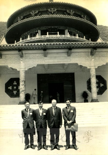 中山樓,為紀念中華民國國父孫中山百年誕辰所建,由建築師修澤蘭女士設計。全樓以中國宮殿建築式樣為本,依山勢而建,以綠色琉璃瓦覆頂,搭配紅簷、白牆,建築主體之屋頂採單檐歇山頂。照片為創辦人張其昀於陽明山中山樓前留影,左一為程光裕教授,左二為宋晞教授,右二為創辦人張其昀先生。